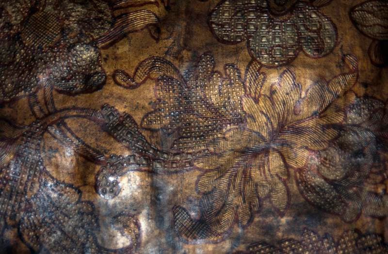 Vue intérieure du rez-de-chaussée : détail du cuir doré.