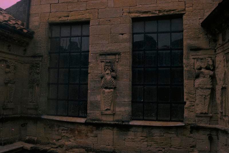 Détail du décor sculpté des façades sur cour, dernier niveau.