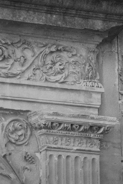 Façade sur cour, aile est, angle sud : porte, chapiteau.