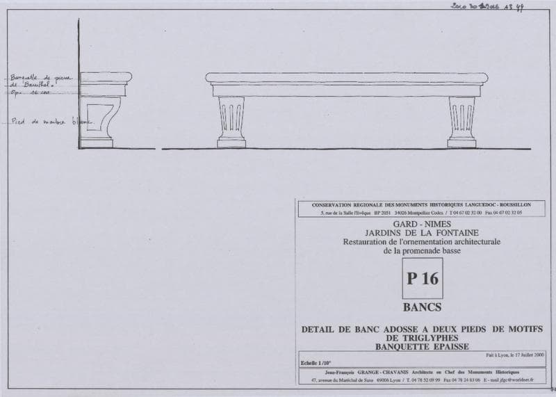 Restauration de l'ornementation architecturale de la promenade basse. P15. Bancs. Détail de banc adossé à deux pieds de motifs de triglyphes, banquette épaisse.