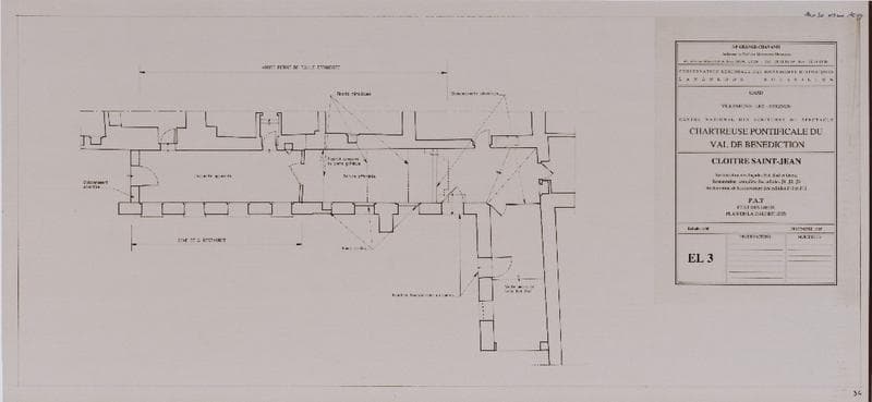 Chartreuse pontificale du Val de Bénédiction. Cloître Saint-Jean : restauration des façades est, sud et ouest. Restauration complète des cellules J1, J2, J3. Restauration des couvertures des cellules J10 et J12. PAT, état des lieux. Plan de la galerie sud. EL3.