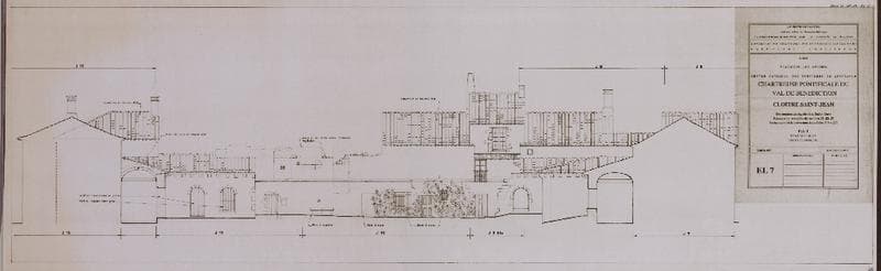 Chartreuse pontificale du Val de Bénédiction. Cloître Saint-Jean : restauration des façades est, sud et ouest. Restauration complète des cellules J1, J2, J3. Restauration des couvertures des cellules J10 et J12. PAT, état des lieux. Elévation ouest. EL7.
