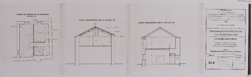 Chartreuse pontificale du Val de Bénédiction. Cloître Saint-Jean : restauration des façades est, sud et ouest. Restauration complète des cellules J1, J2, J3. Restauration des couvertures des cellules J10 et J12. PAT. Charpentes des cellules J10 et J 12. EL8.