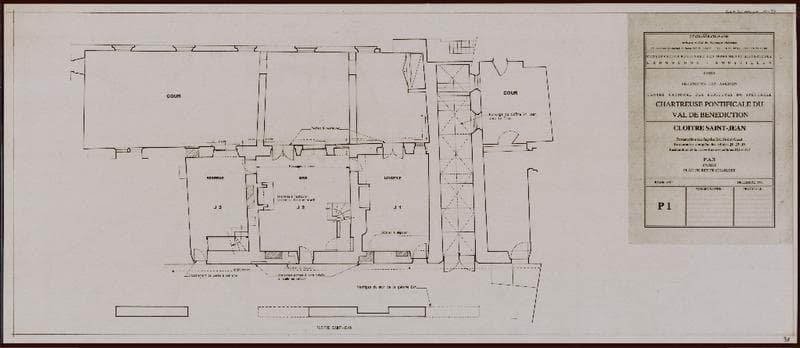 Chartreuse pontificale du Val de Bénédiction. Cloître Saint-Jean : restauration des façades est, sud et ouest. Restauration complète des cellules J1, J2, J3. Restauration des couvertures des cellules J10 et J12. PAT. Projet. Plan du rez-de-chaussée. P1.
