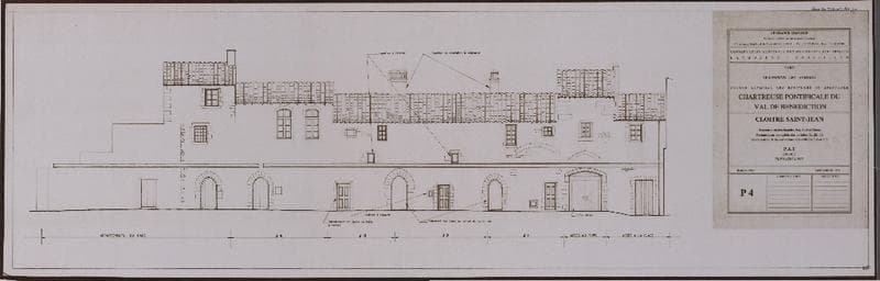 Chartreuse pontificale du Val de Bénédiction. Cloître Saint-Jean : restauration des façades est, sud et ouest. Restauration complète des cellules J1, J2, J3. Restauration des couvertures des cellules J10 et J12. PAT. Projet. Elévation est. P4.