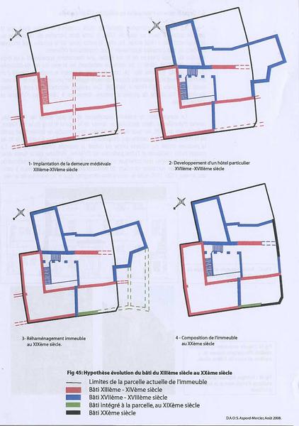 Pré-diagnostic architectural S. Aspord-Mercier, août 2008 : hypothèse de l'évolution du bâti du 13e au 20e siècle.