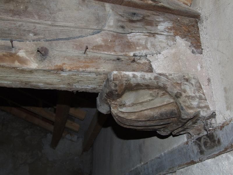 Grande salle sous charpente : corbeau sculpté et traces d'un engoulant peint.