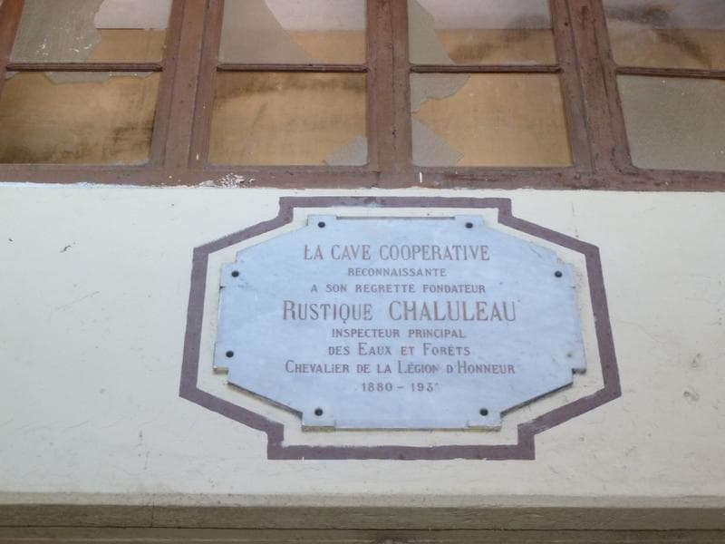 Cave de 1914. Entrée des bureaux. Plaque en l'honneur du fondateur Rustique Chaluleau.