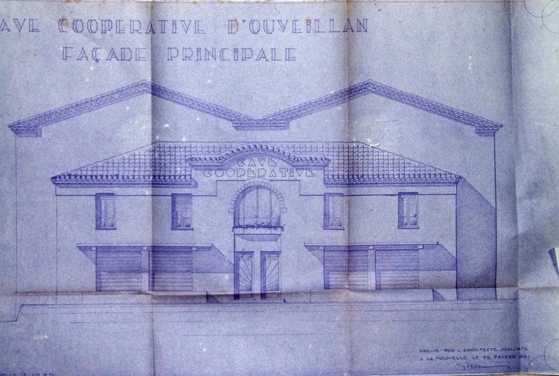 Cave coopérative d'Ouveillan. 5e agrandissement. Signé G. Ladousse, daté du 25 février 1941. Façade principale, échelle : 2 cm pm, papier, encre bleue. Signé Ladousse, daté du 25 février 1941. (Archives de la cave coopérative).