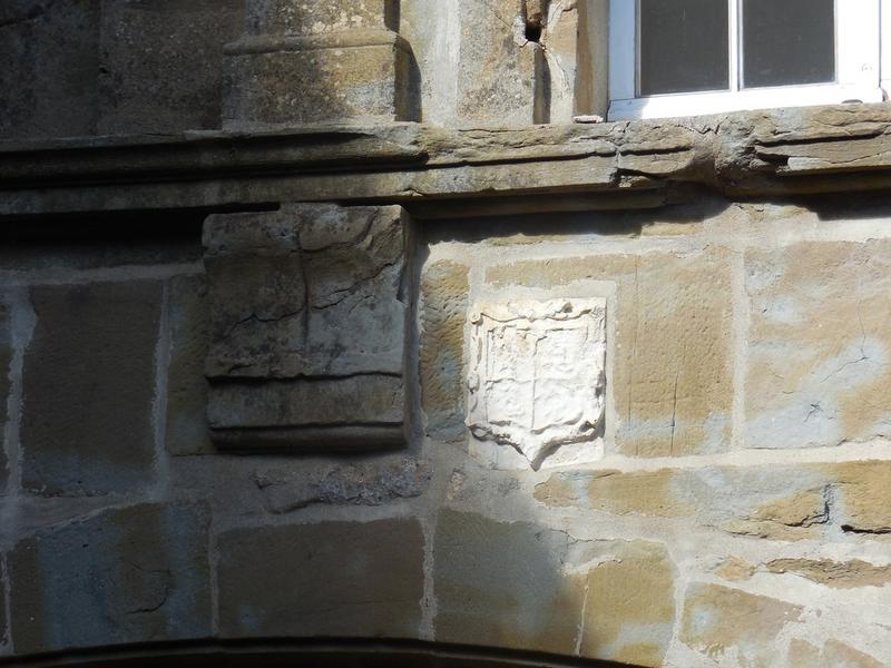 Cour : façade ouest, détail d'une console soutenant la corniche de l'étage et blason de Guillaume de Brettes.