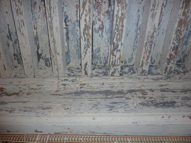 Aile nord, 1er étage, chambre à plafond peint visible sous le badigeon.