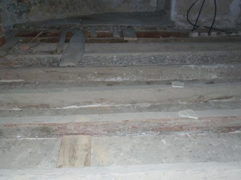 Grenier, plancher à poutres peintes au niveau de l'entrée est.