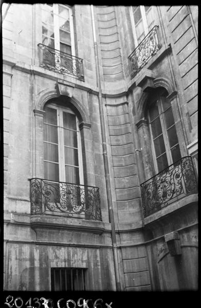 Façade sur rue, renfoncement, fenêtres avec balcon.