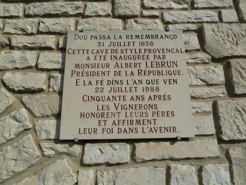 Façade : plaque en pierre commémorant l'inauguration de la cave par le président de la république en 1938, placée en 1988.