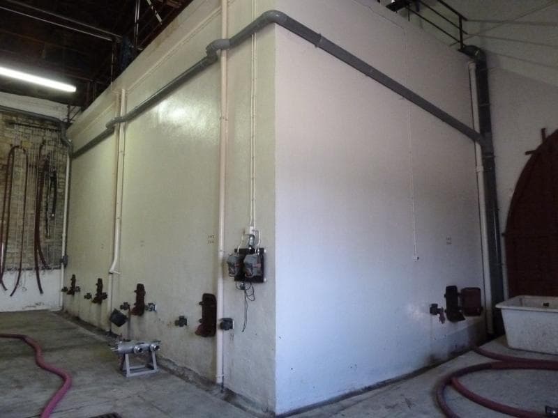 Intérieur : travée de cuves de l'agrandissement de 1964 avec au fond le mur ouest de la cave de 1938.