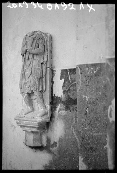 Staute romane sans tête, qui se trouvait contre le mur nod du choeur. Le Christ en pélerin d'Emmaüs, XIIe siècle.