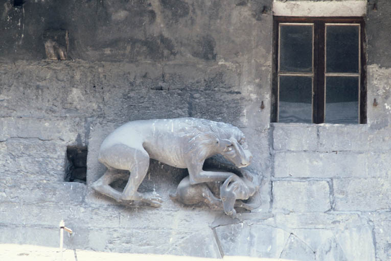 Façade sud partie gauche, sculpture représentant un lion dévorant une chèvre.