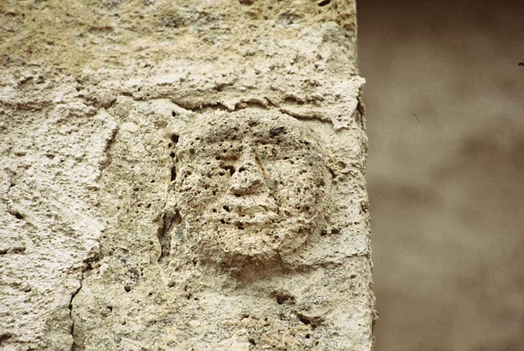 Mur sud du clocher, masque de tuf.
