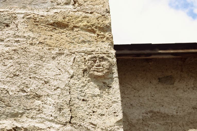 Mur sud du clocher, masque de tuf.