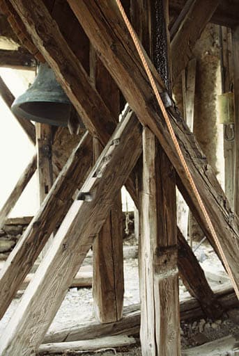 Intérieur du clocher, poutraison armant le clocher et soutenant les cloches.