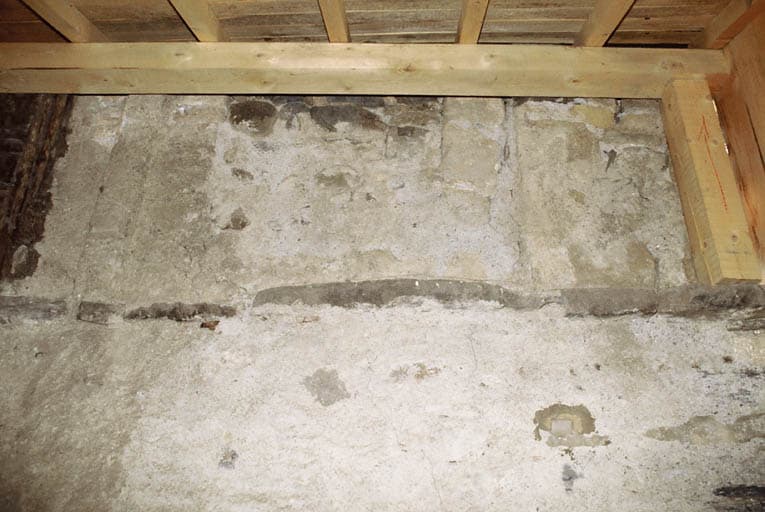 Comble au dessus de la nef, mur nord du clocher autrefois à l'extérieur.