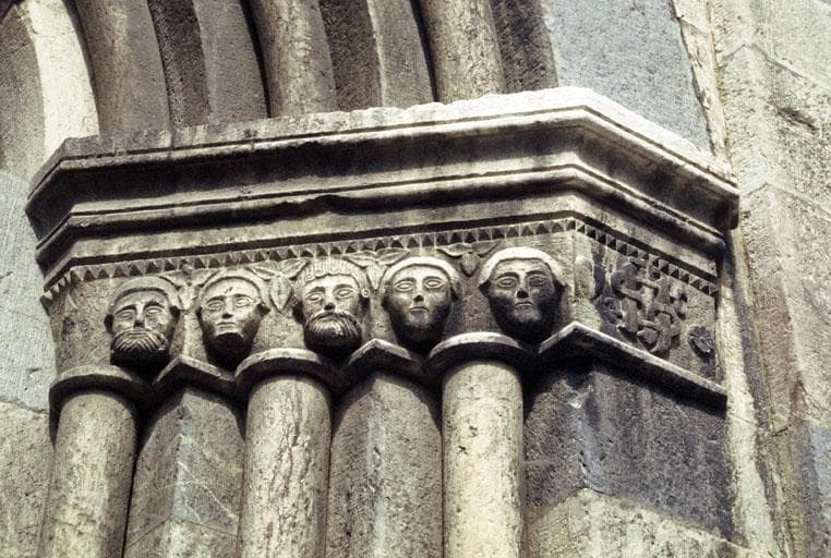 Portail ouvrant sur la première travée de la nef, partie droite, chapiteaux.