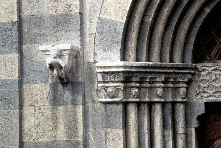 Portail ouvrant sur la deuxième travée de la nef, partie gauche, console sculptée, chapiteaux.