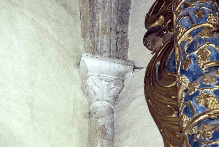 Choeur, chapiteau d'angle recevant l'ogive de la voûte.