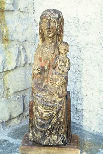 Vierge à l'enfant, statue trouvée sur place et déposée à la mairie, vue de face.