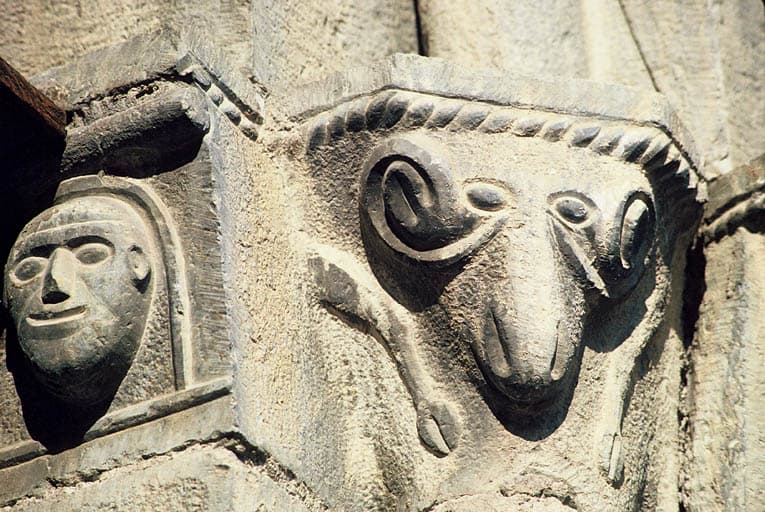 Façade d'entrée latérale, portail d'entrée, détail sur décor sculpté des chapiteaux.