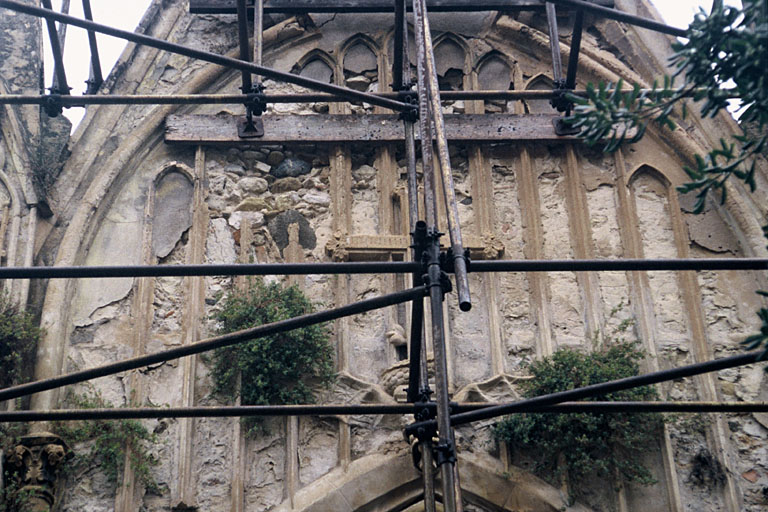 Façade ouest, travée centrale en restauration, détail sur gâble.