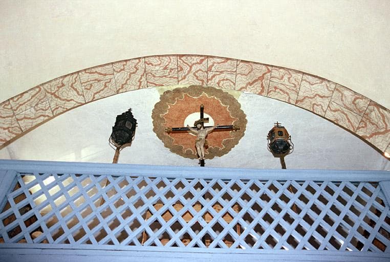 Tribune depuis la nef, lanternes de pénitents et croix de procession.