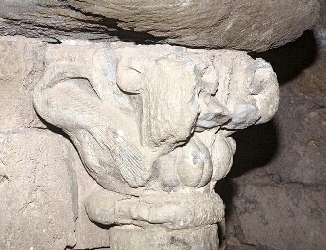 Crypte, chapiteau, paon et tête de bélier.