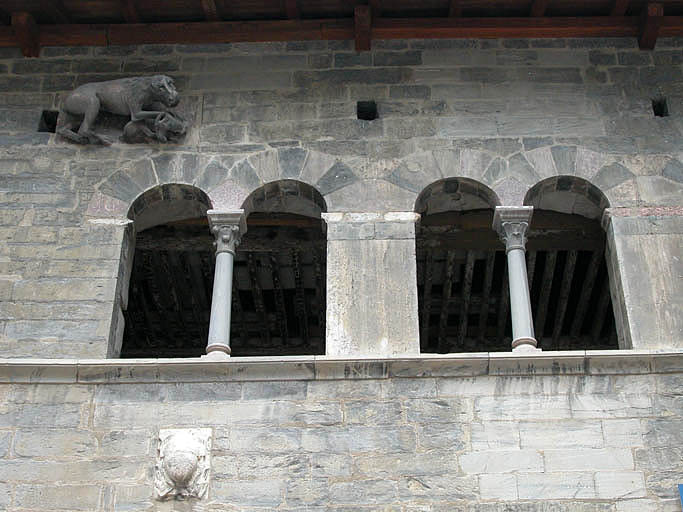 Façade principale, baies géminées et relief sculpté : lion dévorant une chèvre.