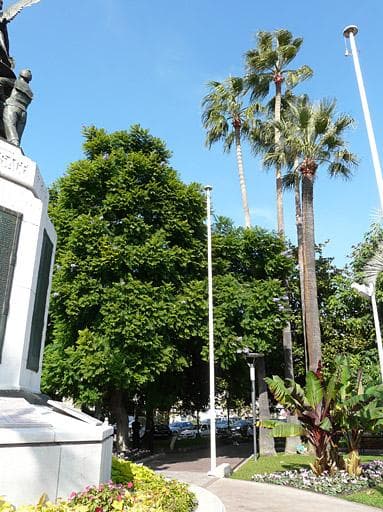 Square à l'est du monument : palmiers et jacaranda mimosaefolia.