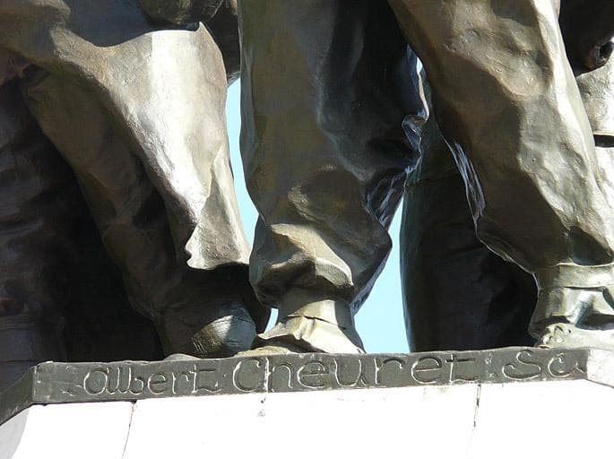 Signature du sculpteur Albert Cheuret sur le socle du groupe supérieur en bronze.