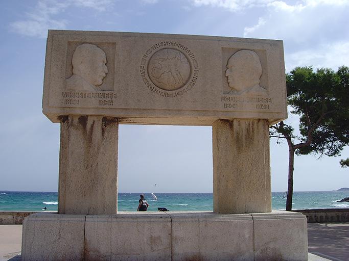 Le monument, l'emplacement choisi est à proximité du domaine Lumière et rappelle une phrase dite un jour par Auguste Lumière :vous aurez là, toujours, le film naturel et mouvant de la mer....