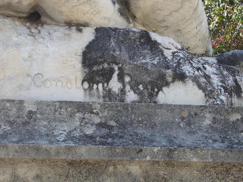 La signature du sculpteur est gravée sur le socle de la statue : Constant Roux.
