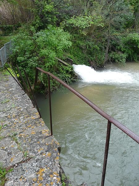 Déversoir du canal dans la rivière, vue depuis le sommet du pont-aqueduc.