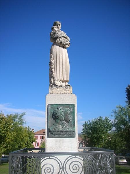 Vue générale du monument constitué d'un piédestal orné d'un bas-relief et surmonté d'une statue de femme tenant un bébé dans les bras.