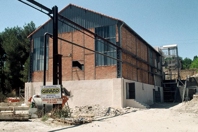 Bâtiment de la machine d'extraction, travaux de réhabilitation en cours, vue de l'extérieur.