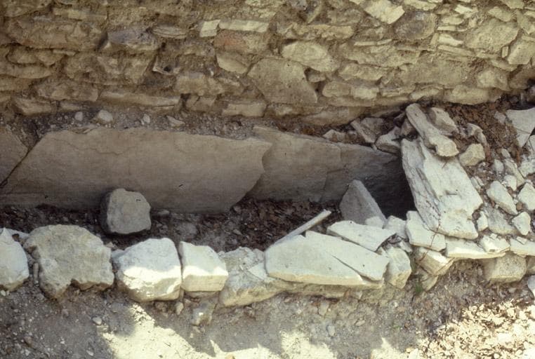 Vue du mur de rempart, détail d'une canalisation. DATE 03/06/2002