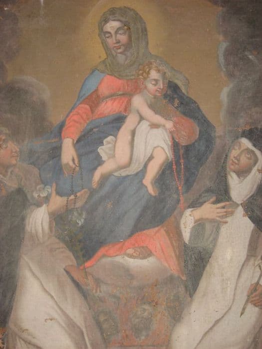 tableau : La Vierge remettant le rosaire à saint Dominique de Guzman et à sainte Catherine de Sienne, vue partielle