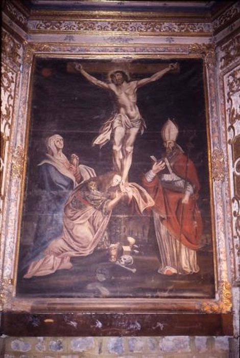 tableau : Christ en croix entre la Vierge, sainte Madeleine et saint Nicolas