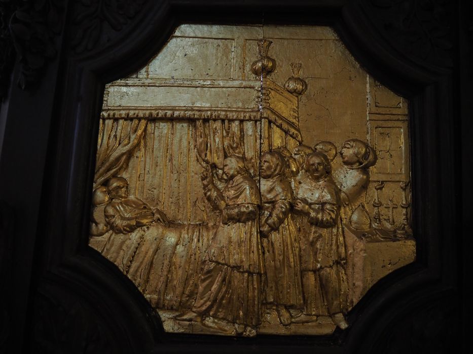 chaire à prêcher : Scènes de la vie de saint Corentin, détail : Corentin reçoit les derniers sacrements en présence des chanoines et des religieux