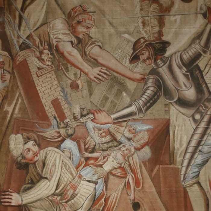 carton de tapisserie : Don Quichotte prenant des marionnettes pour des Maures croit, en les combattant, secourir deux amants fugitifs, détail