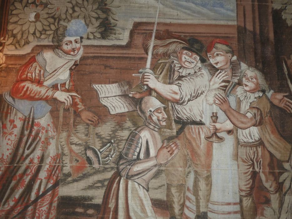 carton de tapisserie : Don Quichotte croit recevoir l’ordre de chevalerie, détail