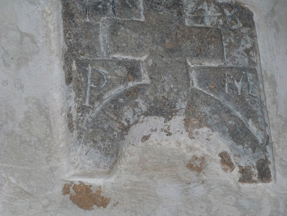 détail d’un bas-relief : Croix au-dessus d’un demi-cercle encadrée des lettres P et M