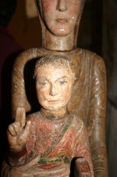 groupe sculpté : Vierge en majesté, détail du visage de l'enfant