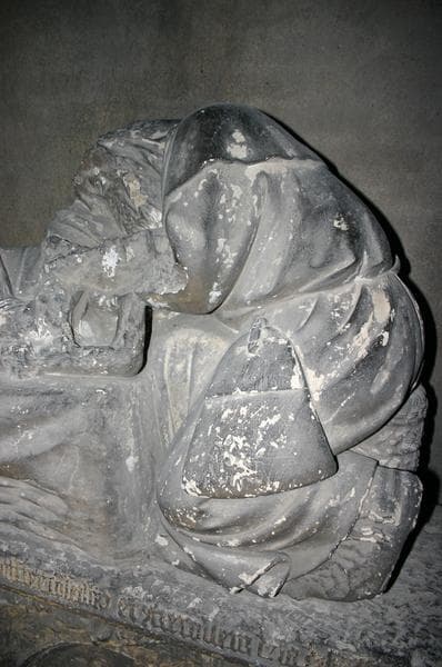 dalle funéraire (gisant), détail, personnage situé au pied du gisant